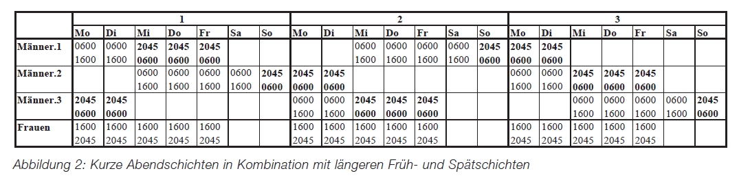 Schichtarbeit in der Fertigung wird zum einen häufig mit festen und einheitlichen Besetzungsstärken verbunden (zB Schichtgruppe A besteht aus zehn Personen) und zum anderen häufig mit nicht verschiebbaren Arbeiten. Oft gibt es aber mehr Gestaltungsspielräume. In Geuenich16 wurde in Hinblick auf altersgerechte Arbeitsgestaltung in einem Teilbereich von BMW-Steyr geprüft, ob auch bei Gruppenarbeit in der Montage Nachtdienste ausgedünnt werden könnten, also in einem Bereich, der als besonders unveränderlich in seinen Abläufen zu erwarten wäre. Insgesamt war die Einschätzung, dass 14 % verschoben werden können. Dies entspricht bei sieben Personen Besetzung bereits einem Arbeitsplatz.