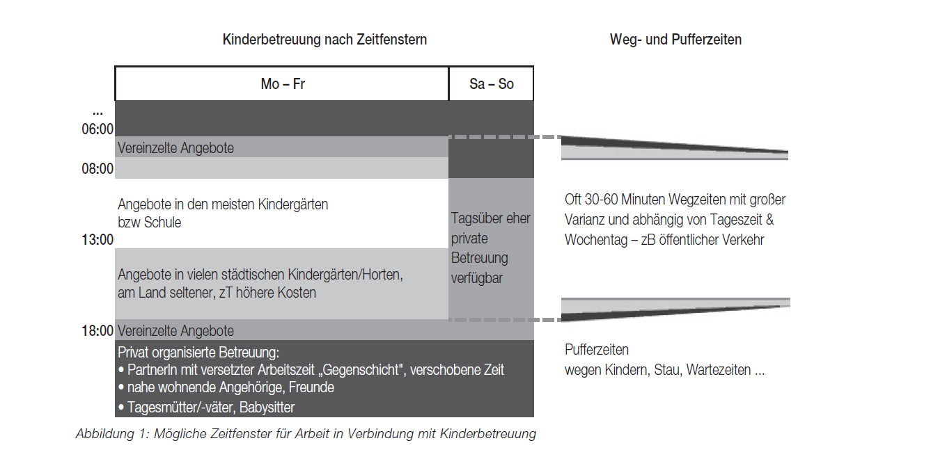 Zusammenfassend ergeben sich aus den Öffnungszeiten der Kinderbetreuungseinrichtungen abzüglich der Wegzeiten stabile Betreuungs- und damit Arbeitszeitfenster untertags, die aber typisch erst nach 7:00 Uhr beginnen und in den späten Nachmittag reichen. Darüber hinausgehende Zeiten setzen eine laufende Abstimmung mit Dritten voraus. Diese dürfte in vielen Fällen, aber nicht immer, praktisch möglich sein. In einer Umfrage von Wallner (2011) unter AN einer Einzelhandelskette mit Kindern unter 16 Jahren im gemeinsamen Haushalt gaben 60 % der TeilnehmerInnen an, Dienste außerhalb der regulären Betreuungszeiten von Schulen oder Kindergärten zu haben. 23,3 % (vorrangig Mütter von Kindern zwischen 0 und 3 Jahren) regeln die Kinderbetreuung nur durch Angehörige (vorrangig Schwieger-/Mutter), weitere 23,3 % finden mit Schule bzw Kindergarten ein Auslangen, 40 % benötigen zusätzlich Angehörige. „Alle 13,3 % der Befragten, welche mehr als zwei Kinderbetreuungsformen in Anspruch nehmen müssen, befinden sich in Führungspositionen und leisten mehr als 5 Überstunden pro Woche.