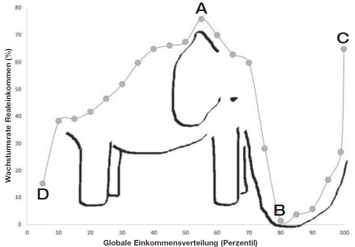 Dass Milanović ein Bild der Weltbevölkerung und deren Einkommensdynamik – historisch zugespitzt – zwischen dem Fall der Berliner Mauer und der globalen Finanzkrise zeichnen kann, verdankt er seiner jahrelangen akribischen Aufbereitung an weltumspannenden – standardisierten – Haushaltsbefragungsdaten in Kombination mit der intellektuellen Übung, die Welt als „1 Land“ darzustellen: vom unteren Ende der Einkommensverteilung bis zum obersten. Der elefantenförmige Kurvenverlauf erzählt grob gesprochen von der Verfestigung der Armut der weltweit Ärmsten (vgl D), vom augenscheinlichen Aufstieg einer süd-ostasiatischen Mittelschicht (vgl A), dem Abstieg der unteren Mittelschicht in wohlhabenderen Ländern (vgl B) und von hohen Globalisierungsgewinnen für die Spitze der Einkommensverteilung (vgl C) in der vom Autor als „heißen Phase der Globalisierung“ bezeichneten Episode 1998 bis 2008.